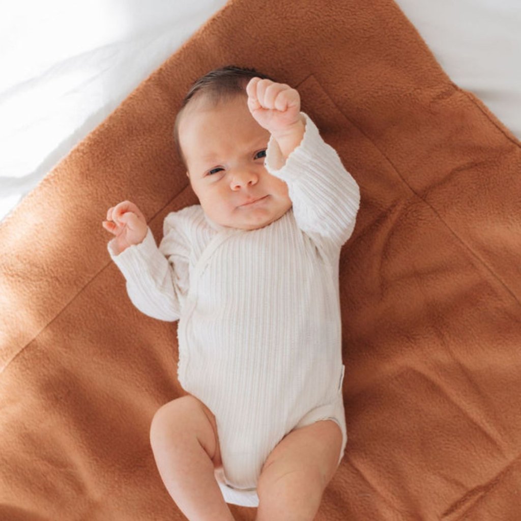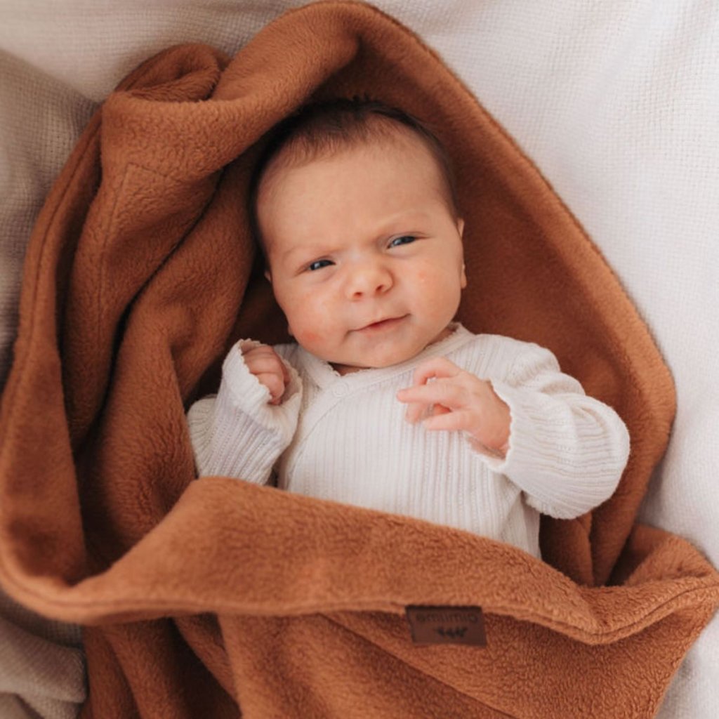 Rozkošná dvouvrstvá měkká deka pro miminko ze 100% BIO bavlněného beránka v karamelové barvě. Praktická dětská deka, která vaše miminko zahřeje v postýlce, kočárku i na cestách.
