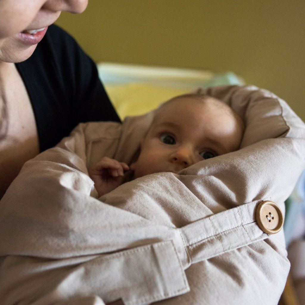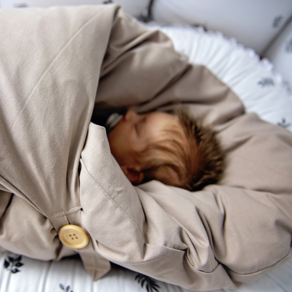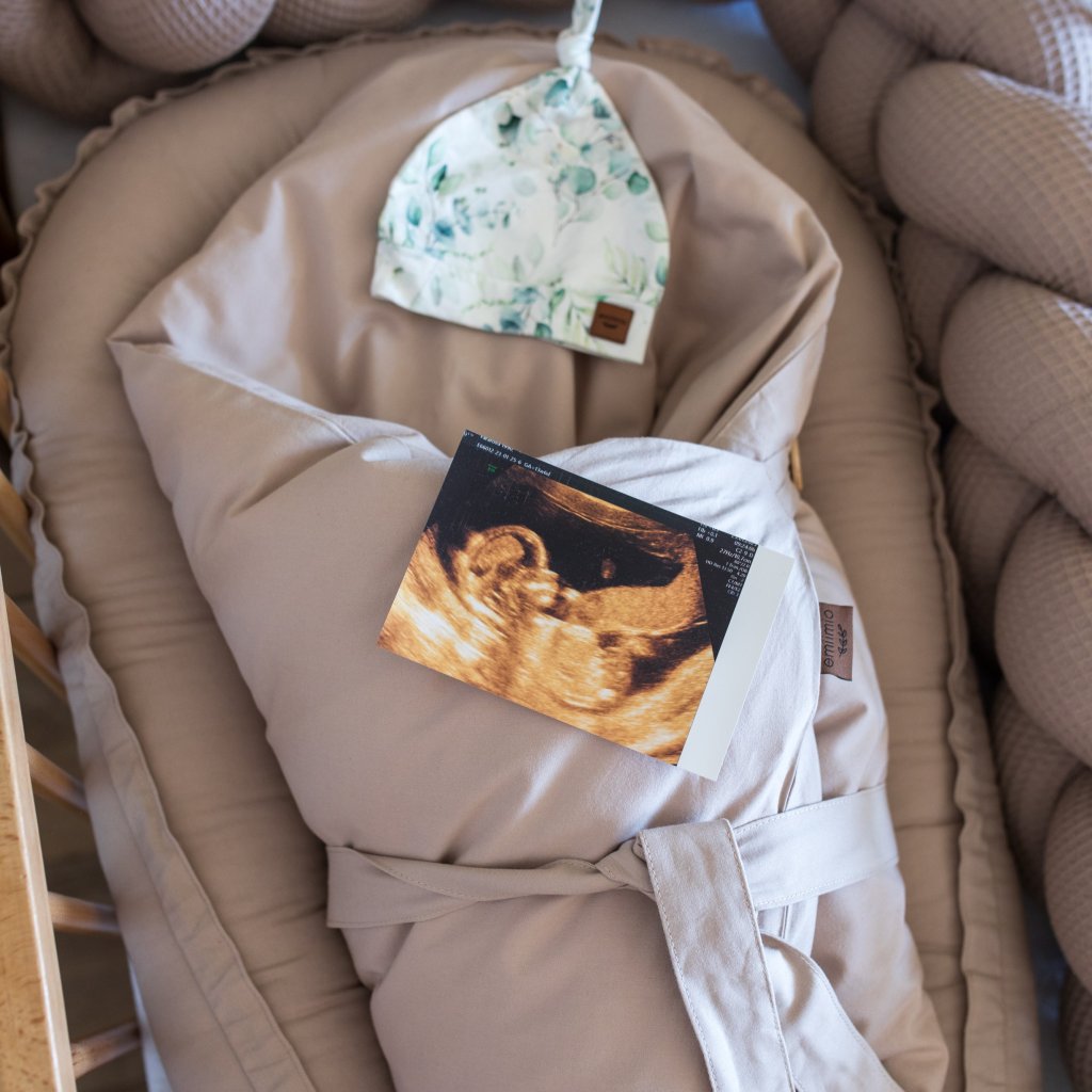 Kvalitní péřová zavinovačka pro miminko v neutrální béžové barvě.