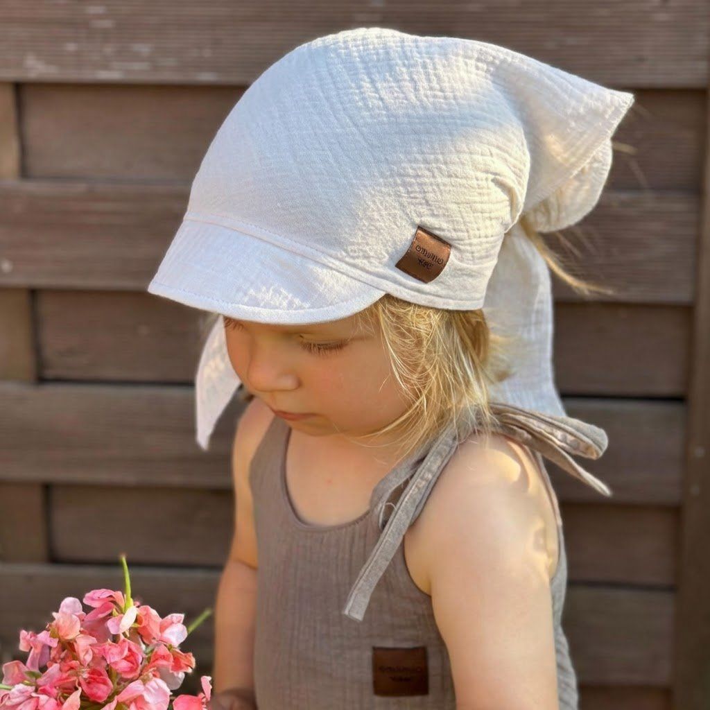 Praktický a lehoučký mušelínový šátek s kšiltem chrání dětskou hlavičku před slunečními paprsky a horkem. Je vzdušný, příjemný k pokožce a díky mušelínu se v něm děti nepotí. Skvělá volba pro horké letní dny!