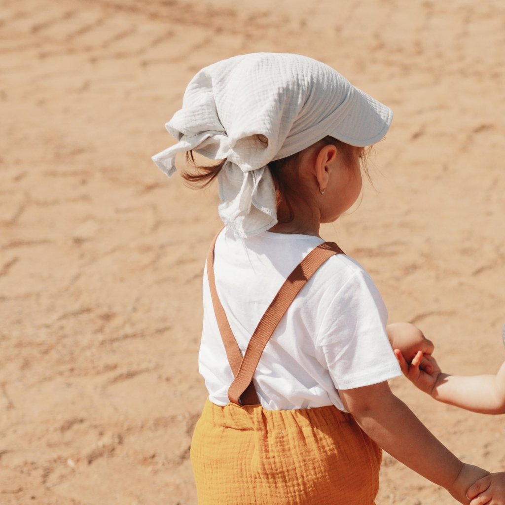 Praktický a lehoučký mušelínový šátek s kšiltem chrání dětskou hlavičku před slunečními paprsky a horkem. Je vzdušný, příjemný k pokožce a díky mušelínu se v něm děti nepotí. Skvělá volba pro horké letní dny!
