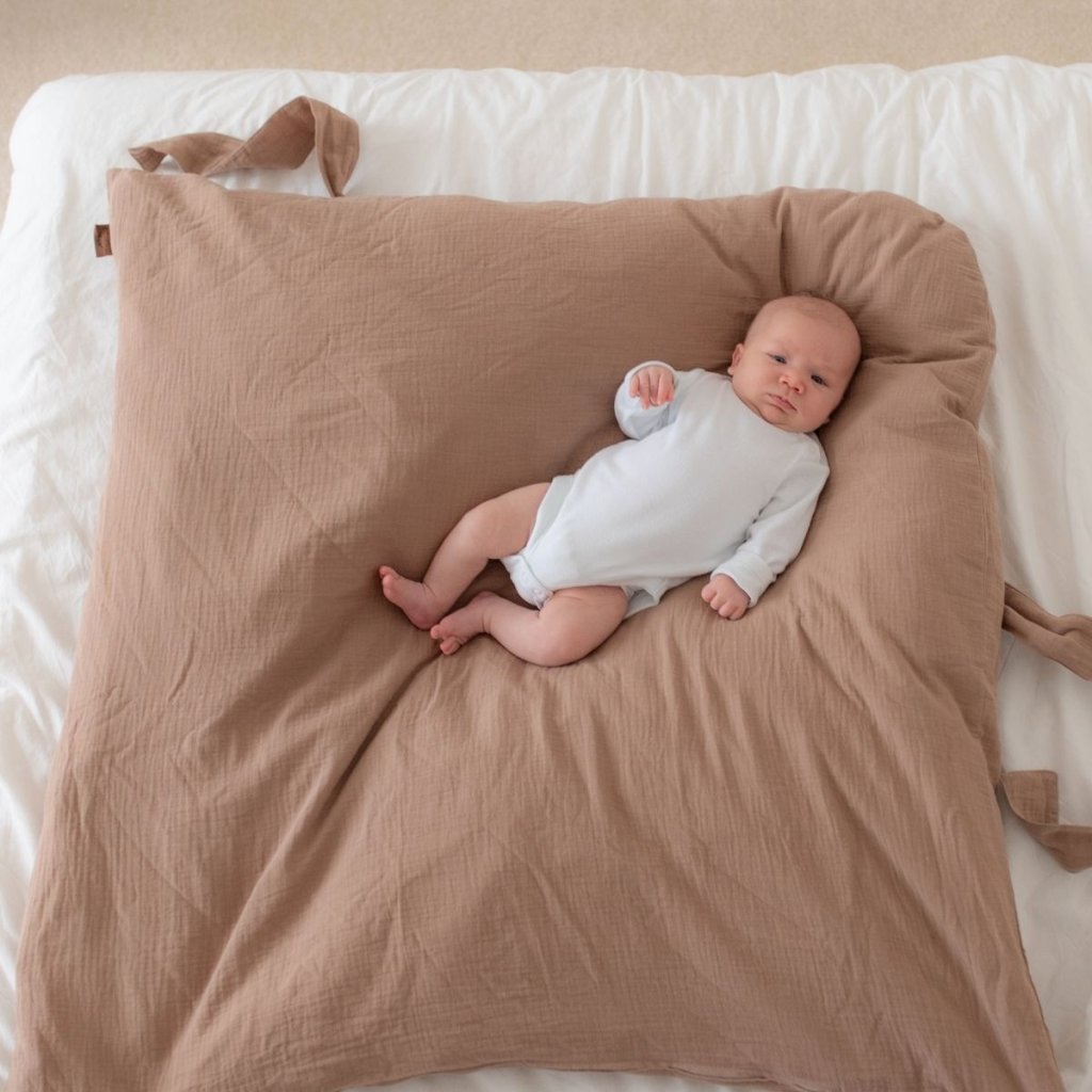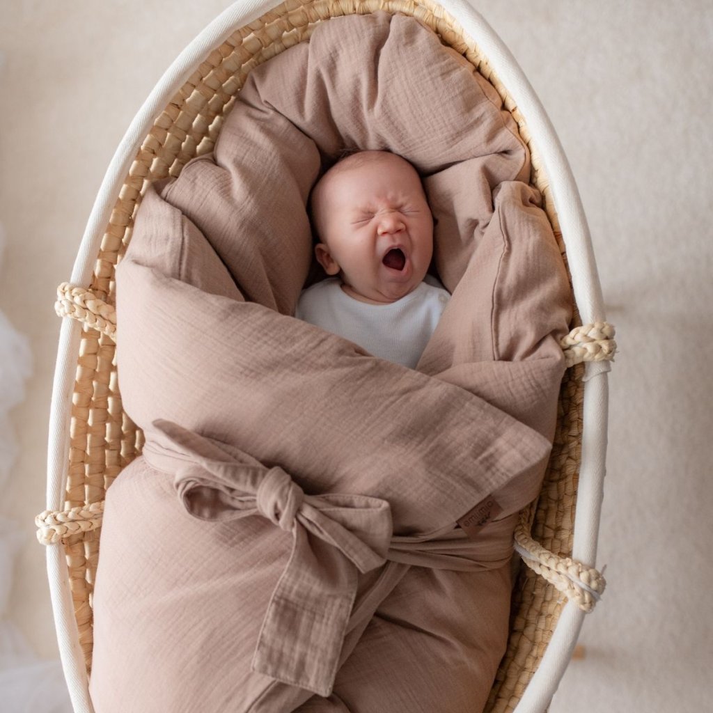 Zavinovačka je plněná pravým husím peřím, které má termoregulační schopnost a povlak je ušitý ze 100% bavlněného mušelínu, který je lehký, prodyšný a skvěle saje vlhkost, takže je ideální pro teplejší dny. Součástí zavinovačky je samostatná stuha pro snadné a pevné zavinutí.