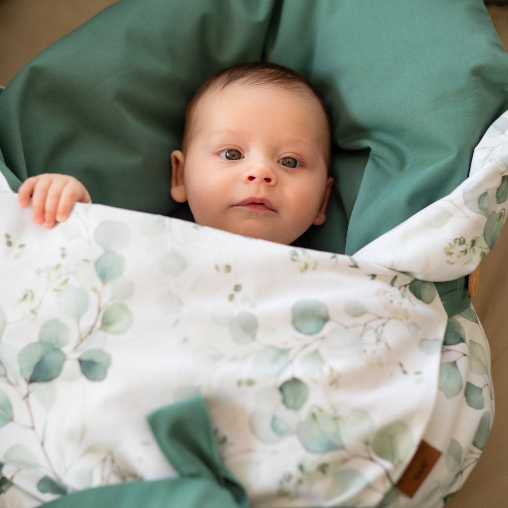 Kvalitní péřová zavinovačka pro miminko v přírodním motivu eucalyptus v kombinaci se zelenou barvou.