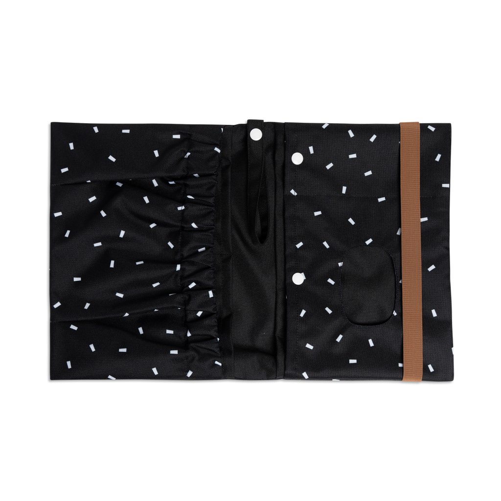 Taška na plenky je opatřena širokou gumou, která ji udrží ve složeném stavu. Díky kompaktním rozměrům se do ní vlezou plenky, ubrousky, náhradní oblečení, dětská kosmetika i třeba podložka k přebalovaní.