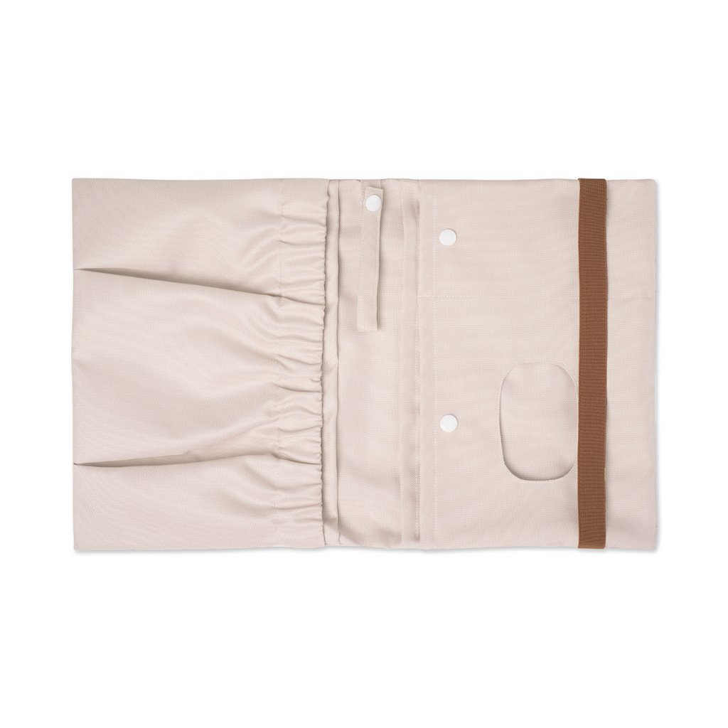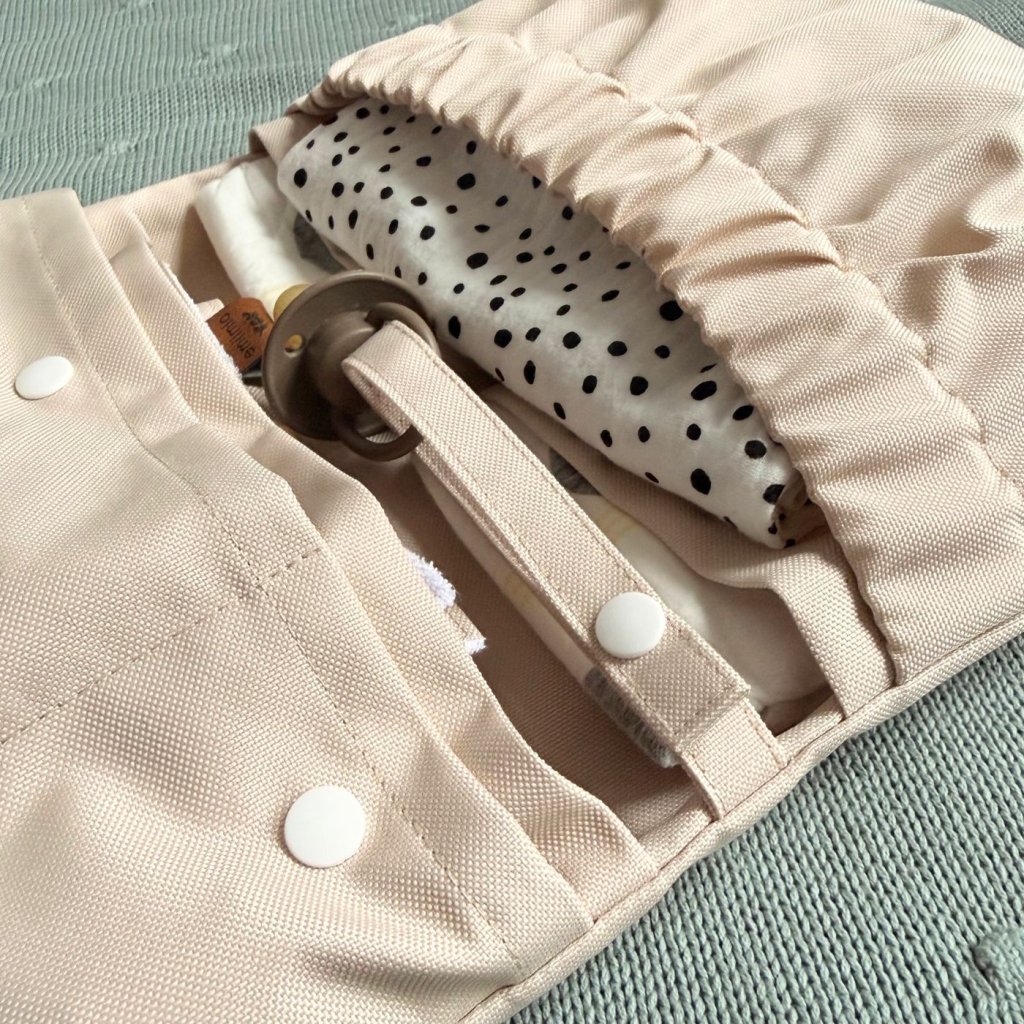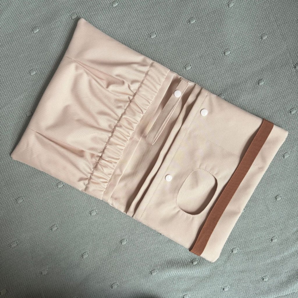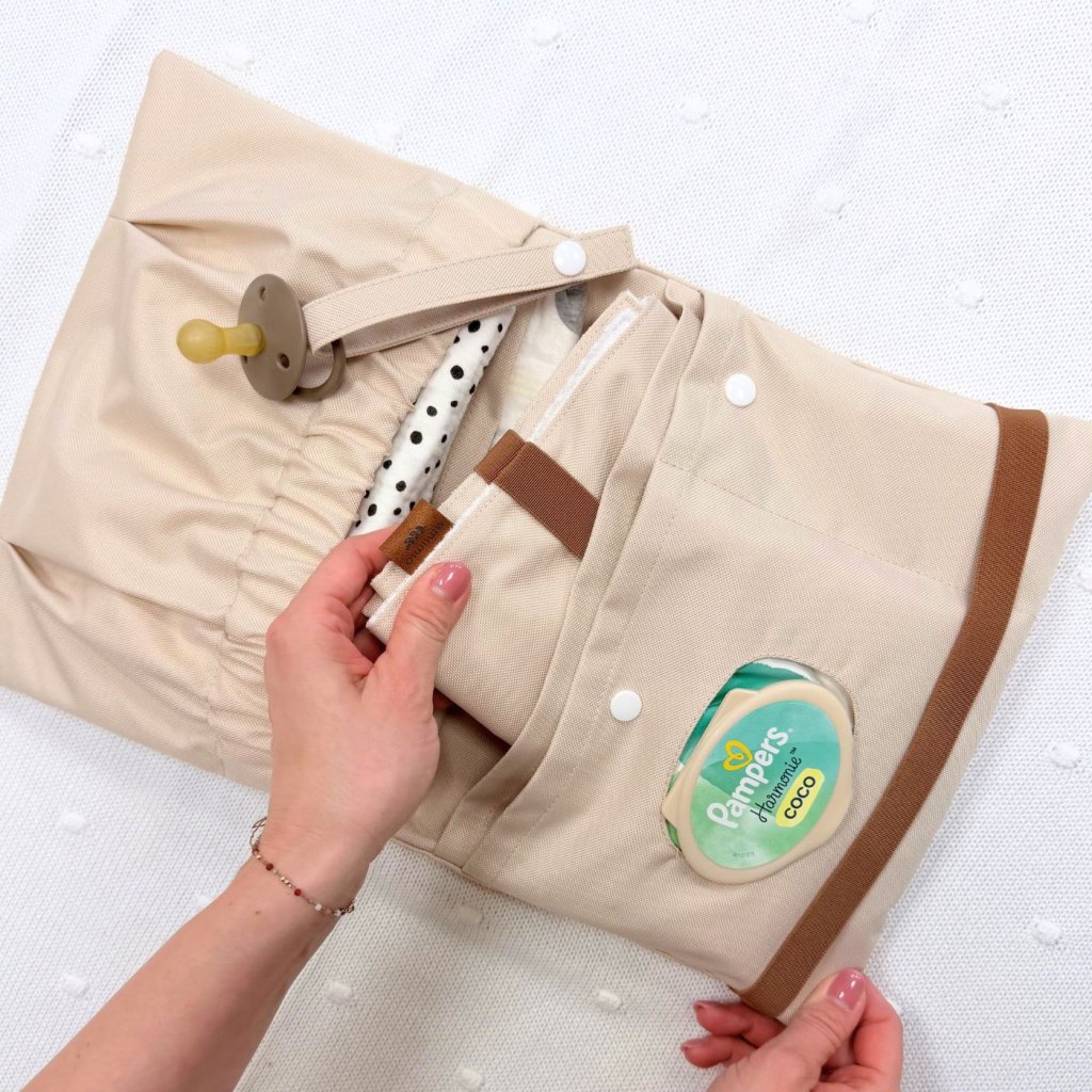 Taška na plenky je opatřena širokou gumou, která ji udrží ve složeném stavu. Díky kompaktním rozměrům se do ní vlezou plenky, ubrousky, náhradní oblečení, dětská kosmetika i třeba podložka k přebalovaní.