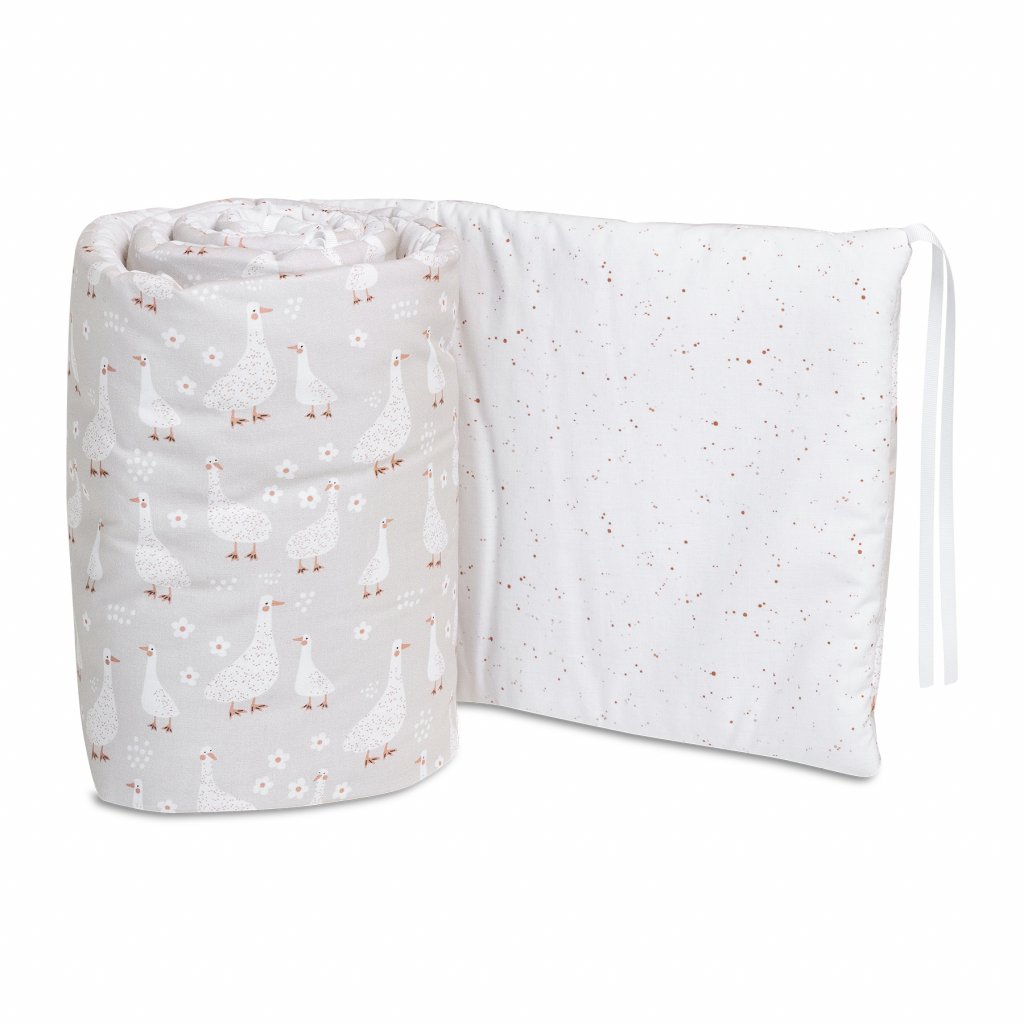 Plochý mantinel husy je ušitý ze 100% bavlny, je vyplněn hypoalergenním dutým vláknem a má šnůrky pro bezpečné uchycení k postýlce.
