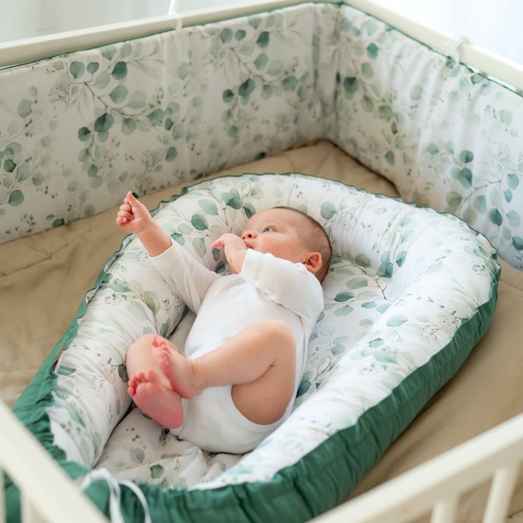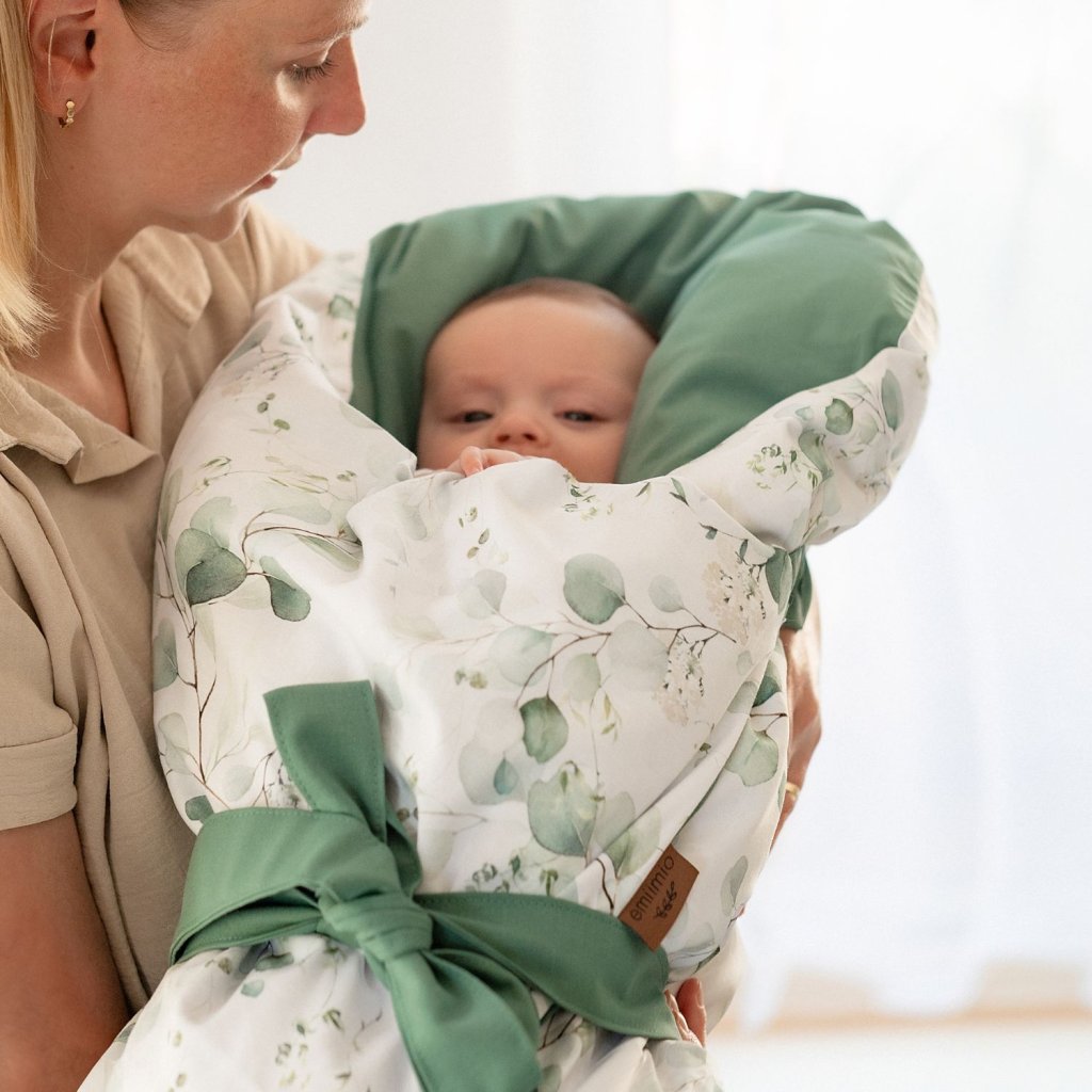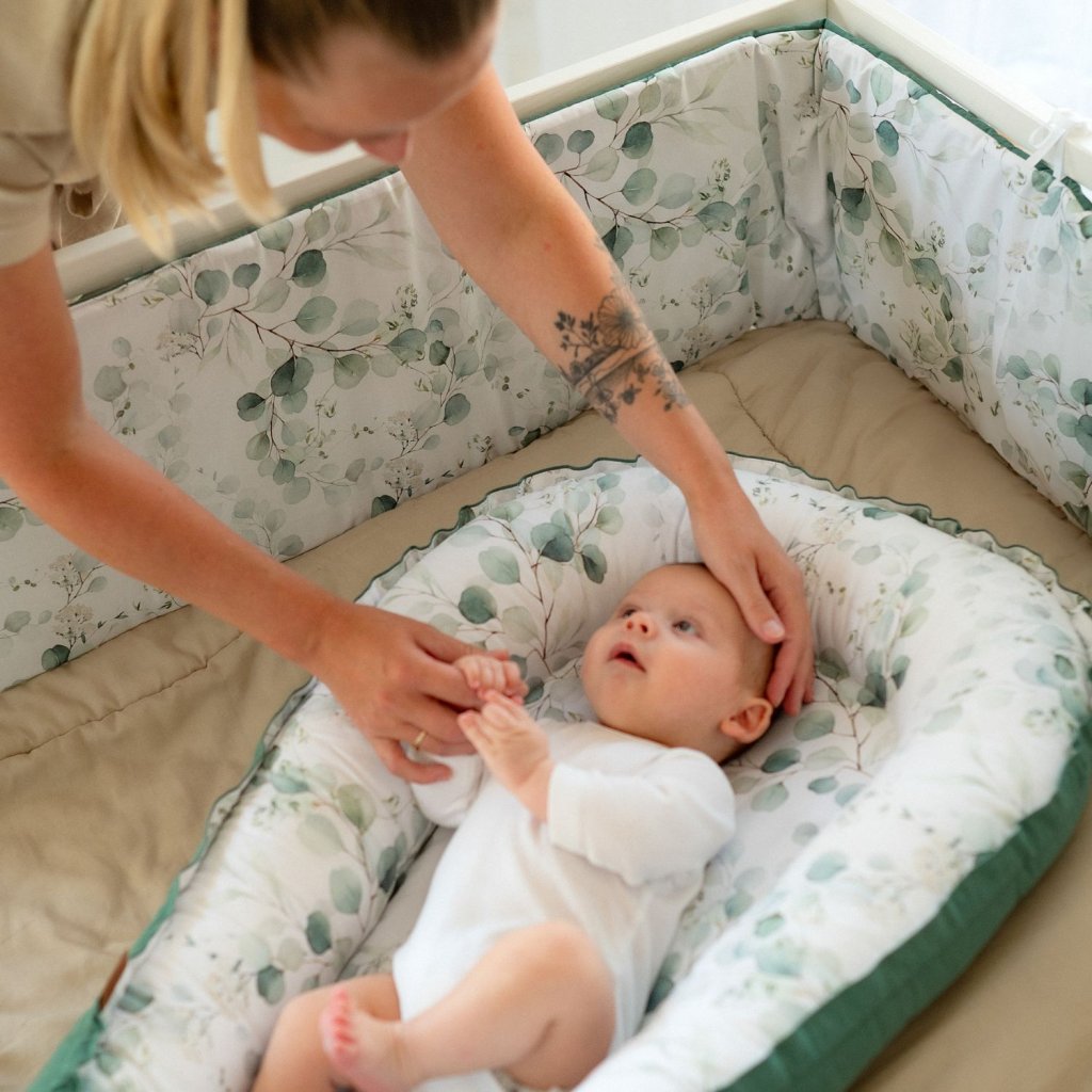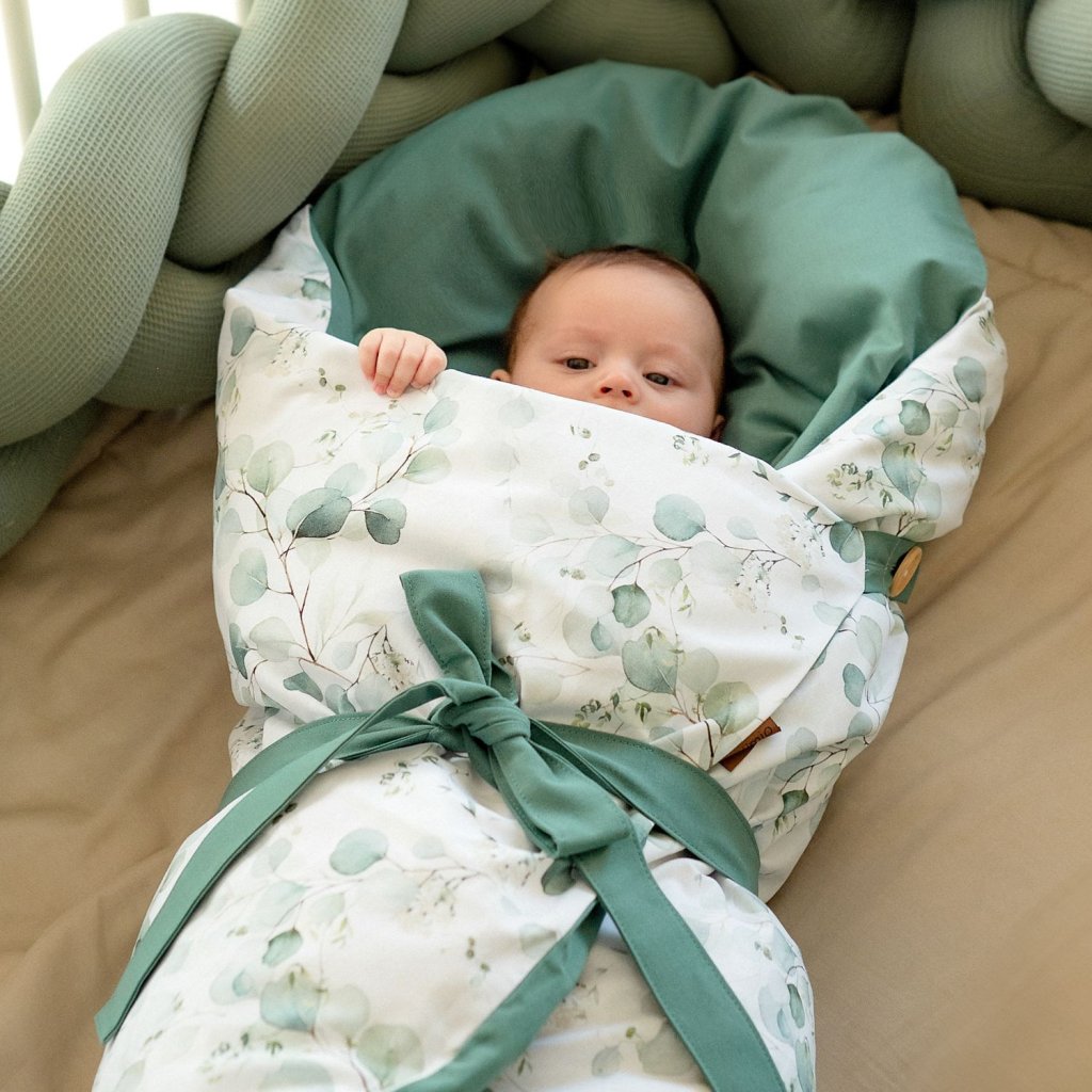 Sada do postýlky ve vzoru eukalyptus v kombinaci se zelenou bavlnou, která zahrnuje základní "must have" kousky výbavičky a doplnit ji můžete minky dečkou.