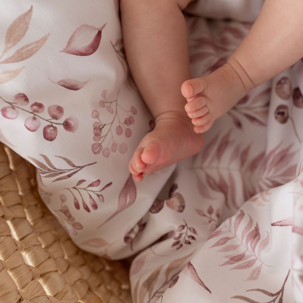 Sada do postýlky v něžném vzoru jeřabiny, která zahrnuje základní "must have" kousky výbavičky.