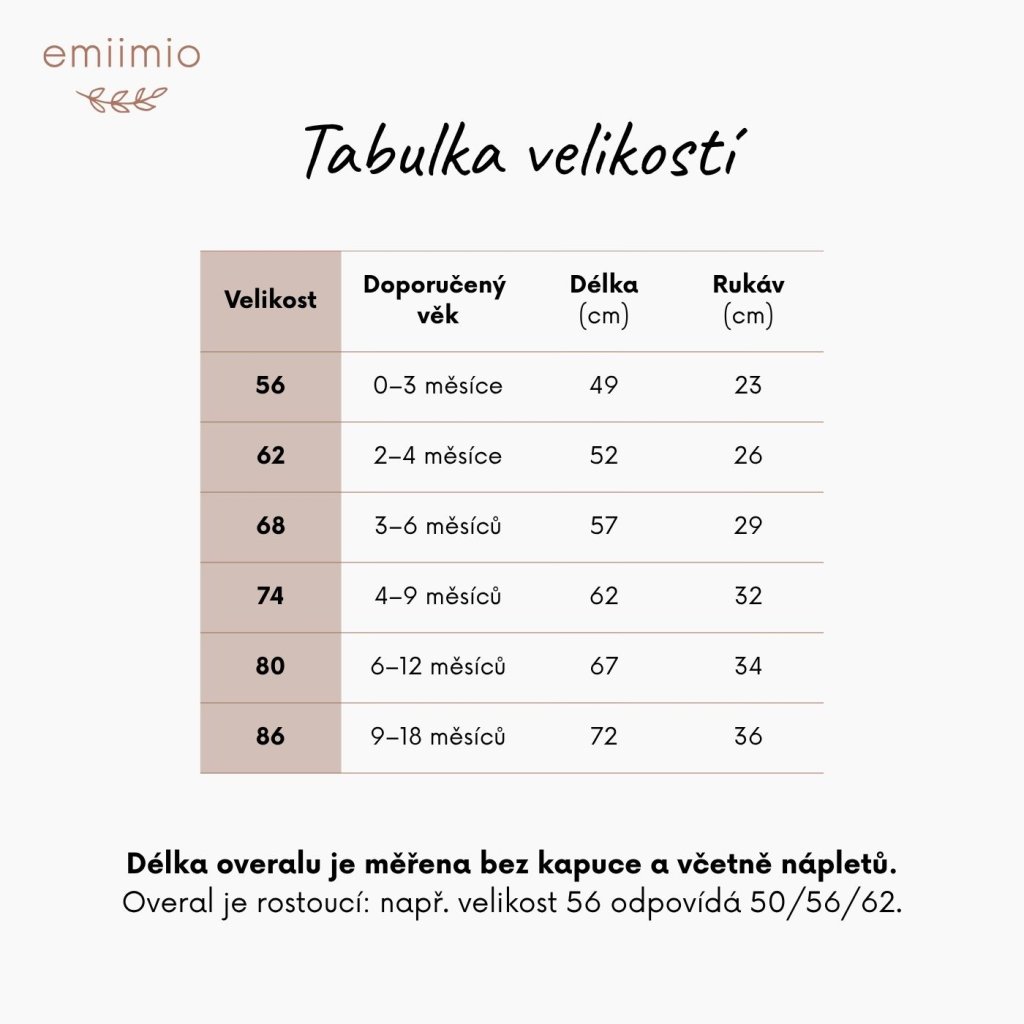 Overal na zip je rostoucí a naše velikosti jsou větší, než běžná konfekce. Dlouhé náplety nejprve ohrnete na maximum a postupně odhrnujete zpět. Overal vydrží přes tři velikosti (např. velikost 62 vydrží přes velikost 56/62/68).